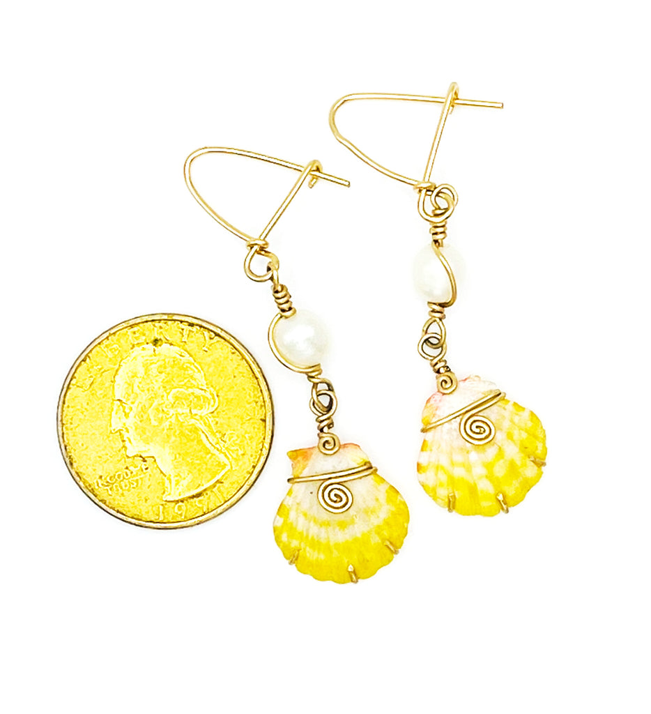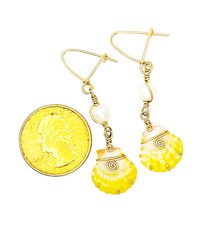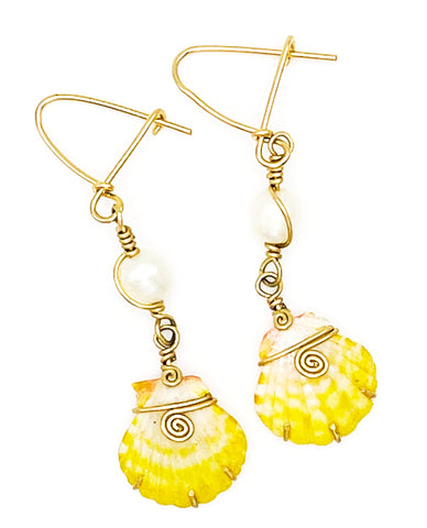 Hawaiian sunrise shells and fresh water pearls made with 14 KT Gold filled. 100% handmade.  Sunrise shells are an extremely rare and sacred shell, containing every color of the spectrum, but usually occur in yellow, orange, and red. They are one of the most treasured and colorful shell found on the beaches of Hawaii. These shells were once the exclusive property of the Hawaiian royalty, truly a wondrous jewel of the sea. They get their name Sunrise shells because of their beautiful color, echoing the sky in a magnificent Hawaii sunrise. They are often found at first light on the beach, when they glow under the luminescent clouds. Sunrises are a rare delight and offer their wearers protection and power that goes back thousands of years in Hawaii's rich history.