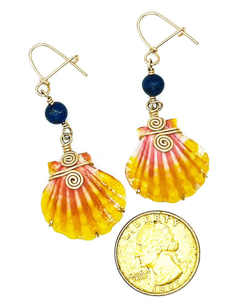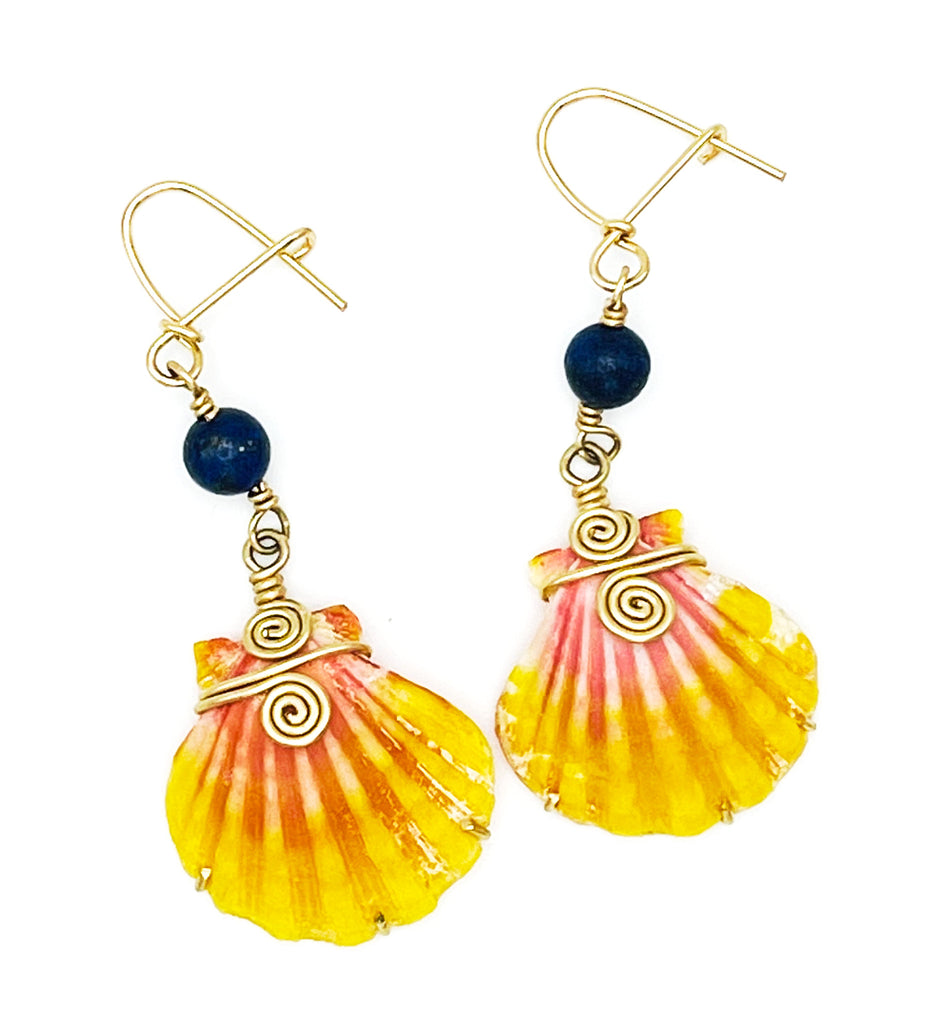 Hawaiian sunrise shells and Sodalite stone made with 14 KT Gold filled. 100% handmade.  Sunrise shells are an extremely rare and sacred shell, containing every color of the spectrum, but usually occur in yellow, orange, and red. They are one of the most treasured and colorful shell found on the beaches of Hawaii. These shells were once the exclusive property of the Hawaiian royalty, truly a wondrous jewel of the sea. They get their name Sunrise shells because of their beautiful color, echoing the sky in a magnificent Hawaii sunrise. They are often found at first light on the beach, when they glow under the luminescent clouds. Sunrises are a rare delight and offer their wearers protection and power that goes back thousands of years in Hawaii's rich history.