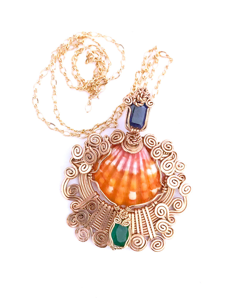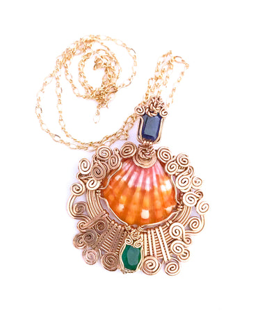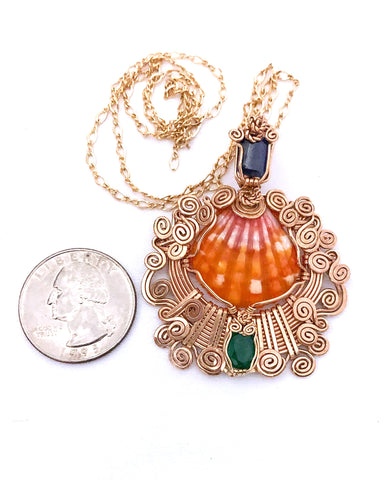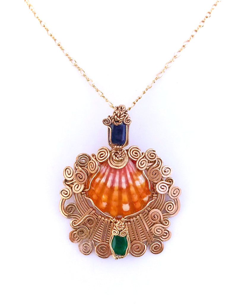 Blue Sapphire, Sunrise shell and Emerald delicately fused in 14 kt Goldfield. it is made In
