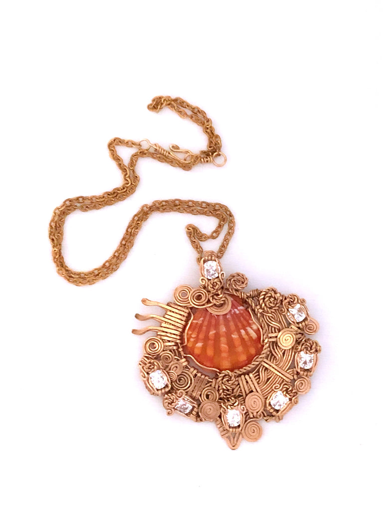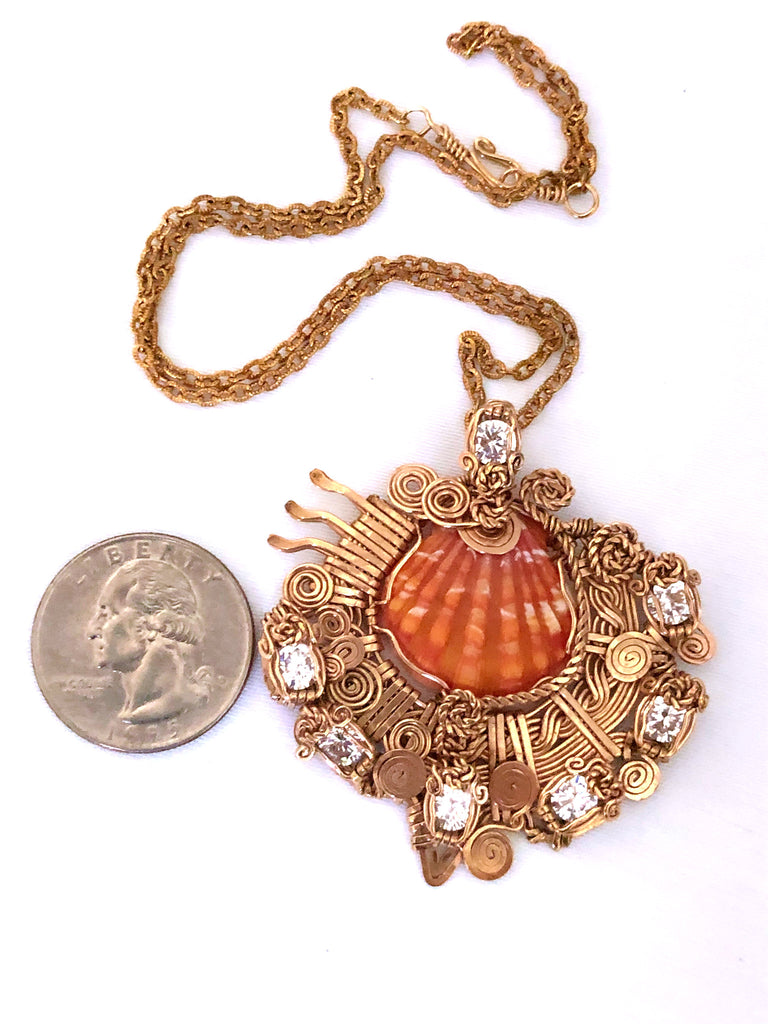 Brasilian zircon with red sunrise shell in 14kt goldfield.