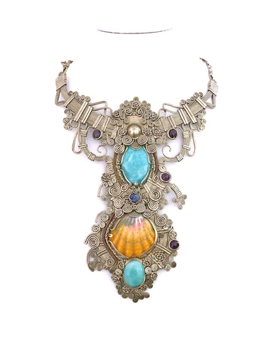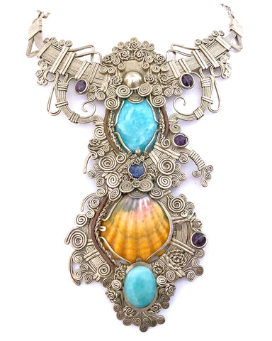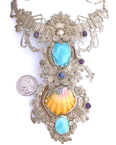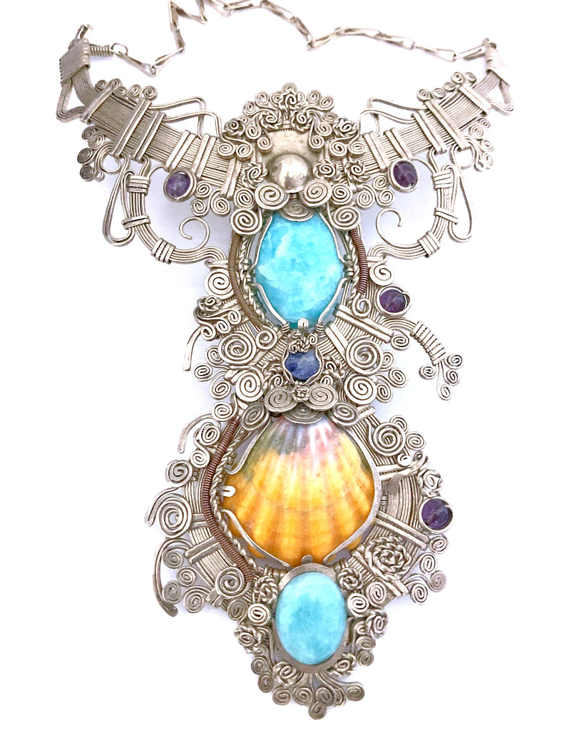 An imposing masterpiece that has two larimar stones and a beautiful sunrise shell. In alpaca silver, adjustable and waterproof
