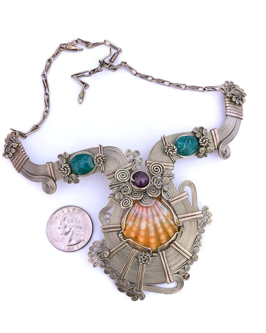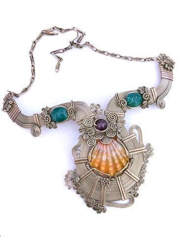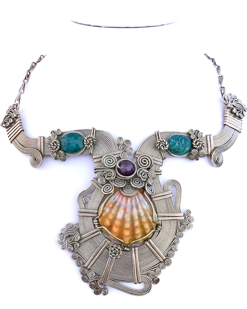 Unique master piece with sunrise shell top quality and Peruvian Turquoise. This necklace is adjustable and waterproof.