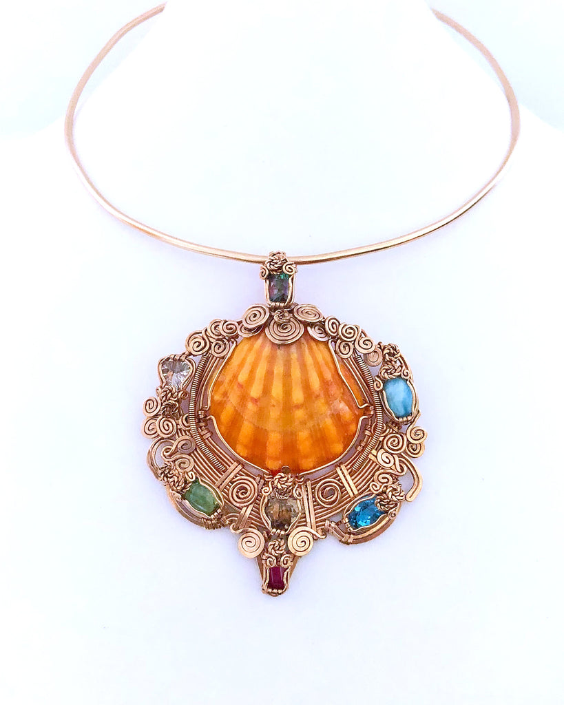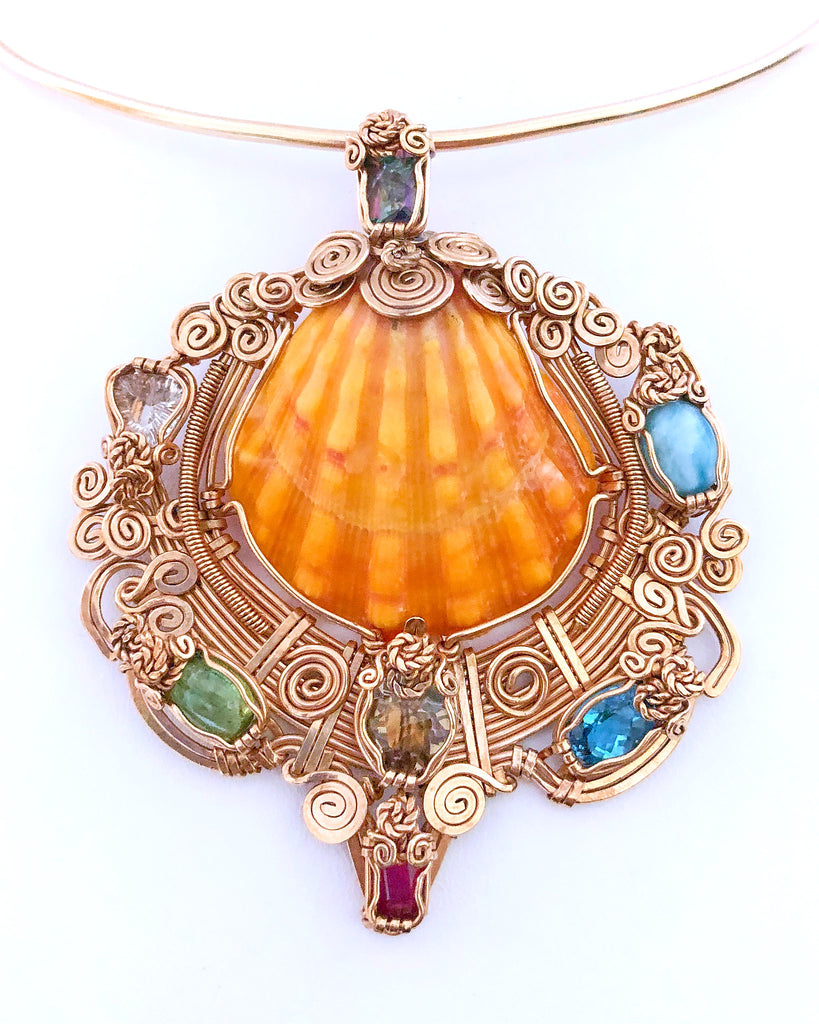 ZIrcon, Emerald, Smoky Quartz, Ruby, Aquamarine, Larimar, Mystic Topaz and Sunrise shell im 14kt. goldfield.