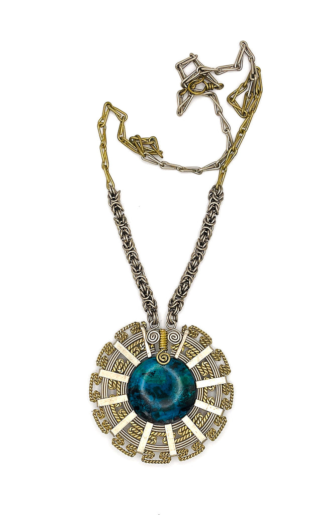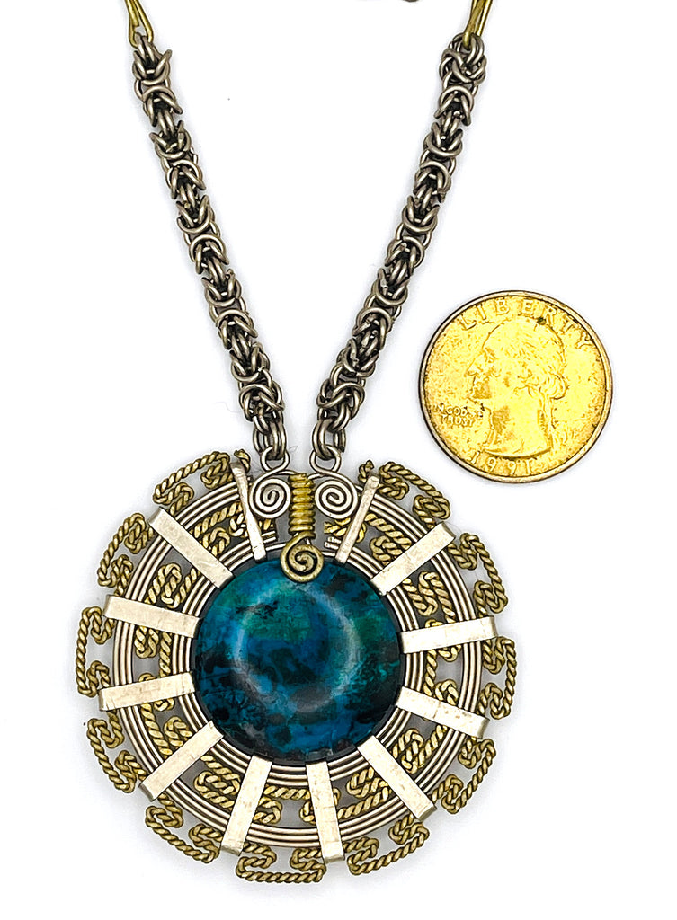 Peruvian chrysocolla in alpaca silver and bronze. Chrysocolla has the ability to bring harmony, increase wisdom and guide you toward discretion. It promotes level headedness, encouraging clarity of thought and a neutral, calm attitude during turbulence by purifying the home, environment and the mind. Use it to decrease nervousness and irritability.