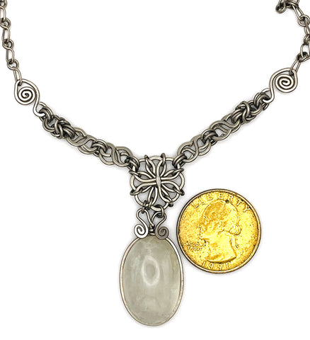 Moonstone in alpaca silver. It is a metal of the result of the combination of 50% of silver with 50% of copper. It is waterproof and adjustable.  Moonstone is good for activating your creative and intuitive power of feminine energy which helps you get in tune with your true emotions. It can help balance and cool down your emotions and tension. The tranquil energy of the moonstone invites creativity, restoration, and motherly protection.