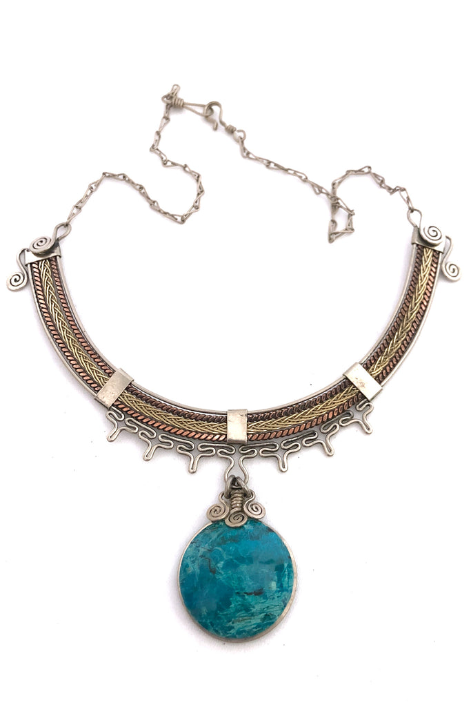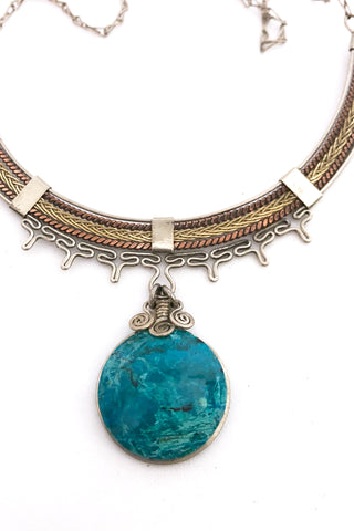 Peruvian chrysocolla stone worked in alpca silver, copper and bronze metals.