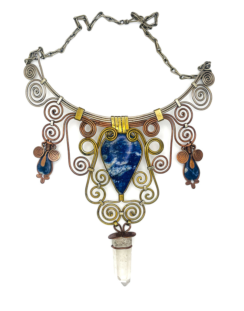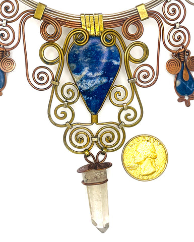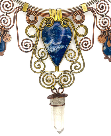 Lapis lazuli stone and Cristal quartz in alpaca silver metal. It is a metal of the result of the combination of 50% of silver with 50% of copper. It is waterproof and adjustable. Lapis Lazuli assists to confront and speak one's truth and inspires confidence. It bonds relationships, aiding in expression of feelings and emotions. Lapis Lazuli boosts the immune system, purifies blood, lowers blood pressure, cooling and soothing areas of inflammation. Cristal quartz is excellent for harmonizing and stabilizing one's environment and is helpful in romantic relationships. It is said to amplify healing energy and is particularly effective for chronic fatigue, arthritis, bone injuries, depression, diabetes, fibromyalgia and intestinal troubles.
