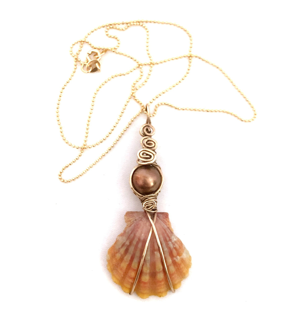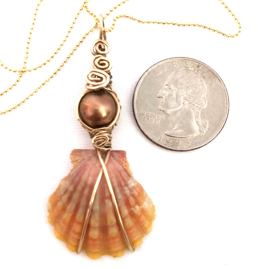Unique sunrise shell with chocolate Tahitian pearl in 14 kt goldfield.