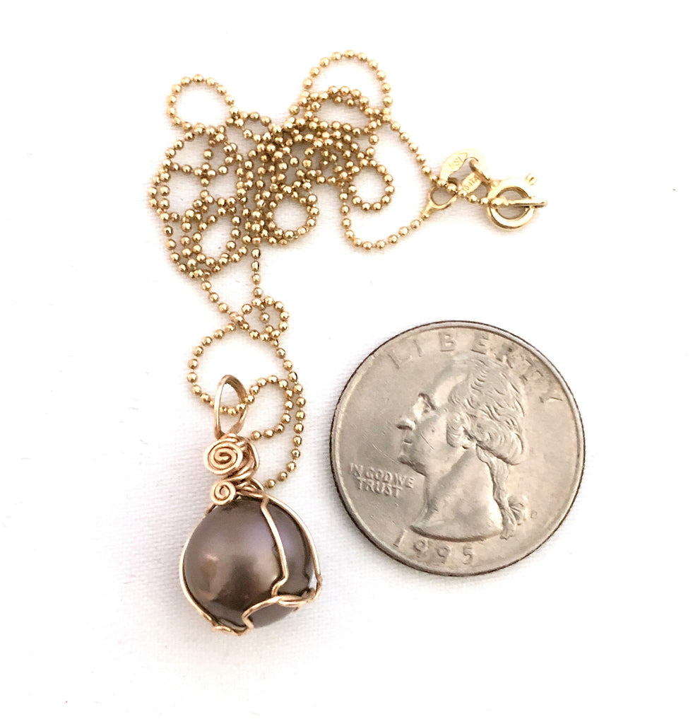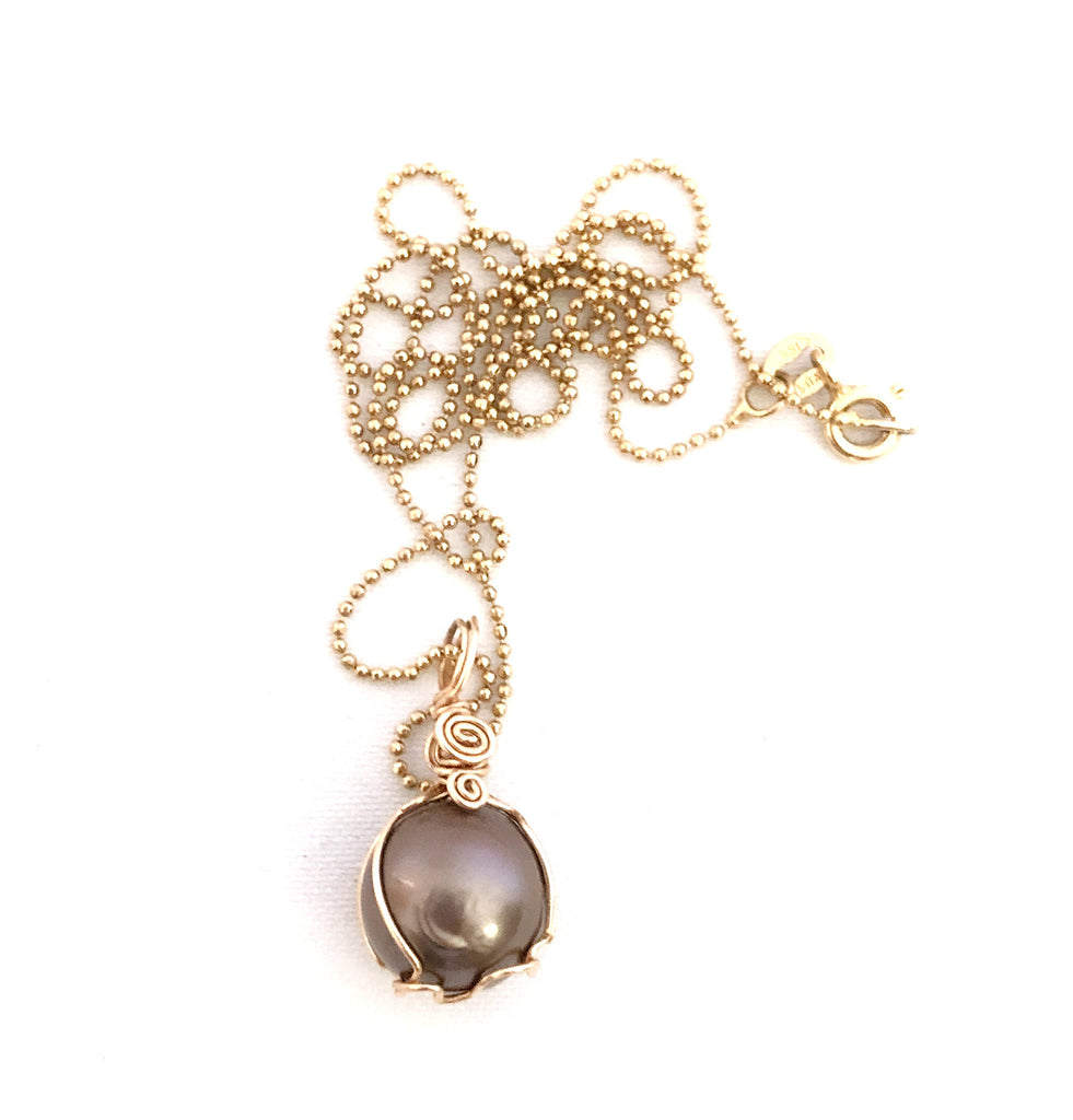 Black Tahitian pearl with red hue in 14kt goldfield.
