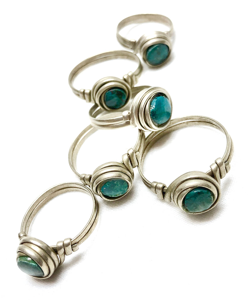 Chrysocolla or Peruvian Turquoise in alpaca silver. It is a metal of the result of the combination of 50% of silver with 50% of copper. It is waterproof. Chrysocolla is known as the "Stone of Communication,";symbolizing peace, tranquility, and healing. It is associated with the goddesses of love and beauty, Aphrodite and Venus, and is believed to facilitate effective expression and transformation. This vibrant blue-green mineral, rich in copper, aids in emotional balance and self-expression, making it a powerful stone for spiritual transformation. Additionally, chrysocolla is linked to prosperity and business acumen, enhancing both analytical and intuitive abilities