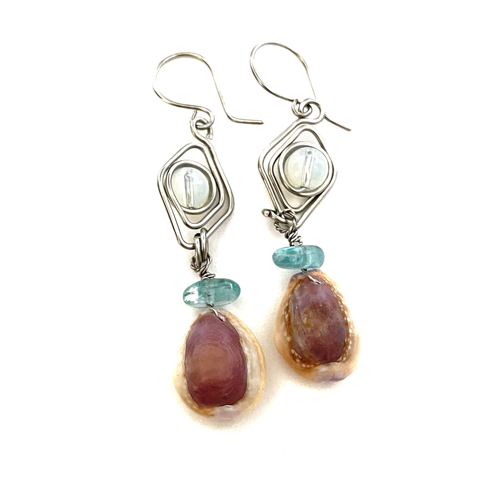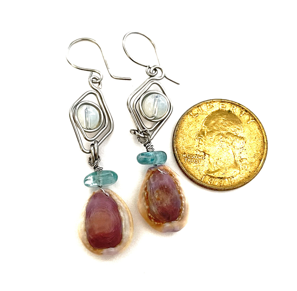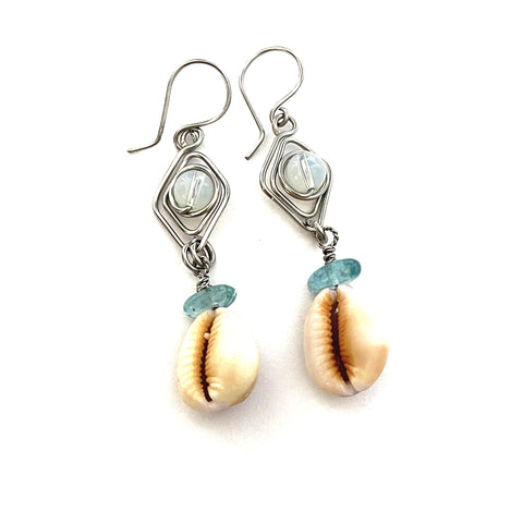 Hawaiian sea shells from Sunset beach with Aquamarin stone and moon stone in stainless steel. I have snorkeled to find the shells, I clean them, select and create these beautiful earrings.